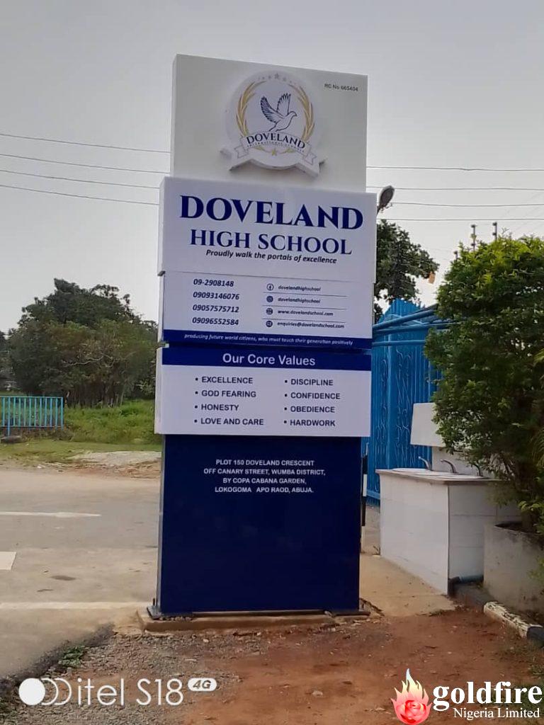 Production, delivery, and Installation of Doveland School Signages at Abuja. Both internal and external Signs. Some illuminated and non-illuminated
